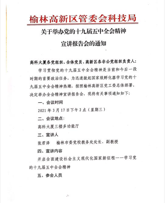 2020年10月26日至29日,中國共產(chǎn)黨第十九屆中央委員會第五次全體會議在北京召開。這次全會是在全面建成小康社會勝利在望、全面建設社會主義現(xiàn)代化國家新征程即將開啟的重要歷史時刻召開的一次十分重要的會議。因此,榆林高新區(qū)黨工委總體部署,決定舉辦全會精神宣講報告會議,將全面深入學習黨的十九屆五中全會精神作為最重要的政治任務抓牢抓實。