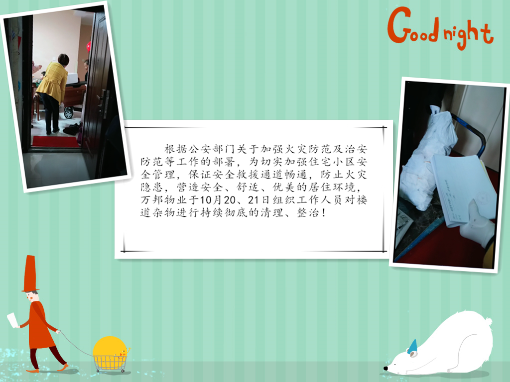 根據公安部門關于加強火災防范及治安防范等工作的部署,為給業主創造一個優美、舒適、安全的居住環境。我物業公司一直堅持不懈的做著此工作,本月針對長期占用公共區域堆放雜物的業戶進行統一上門清理,并向業主傳達相關消防法律知識。