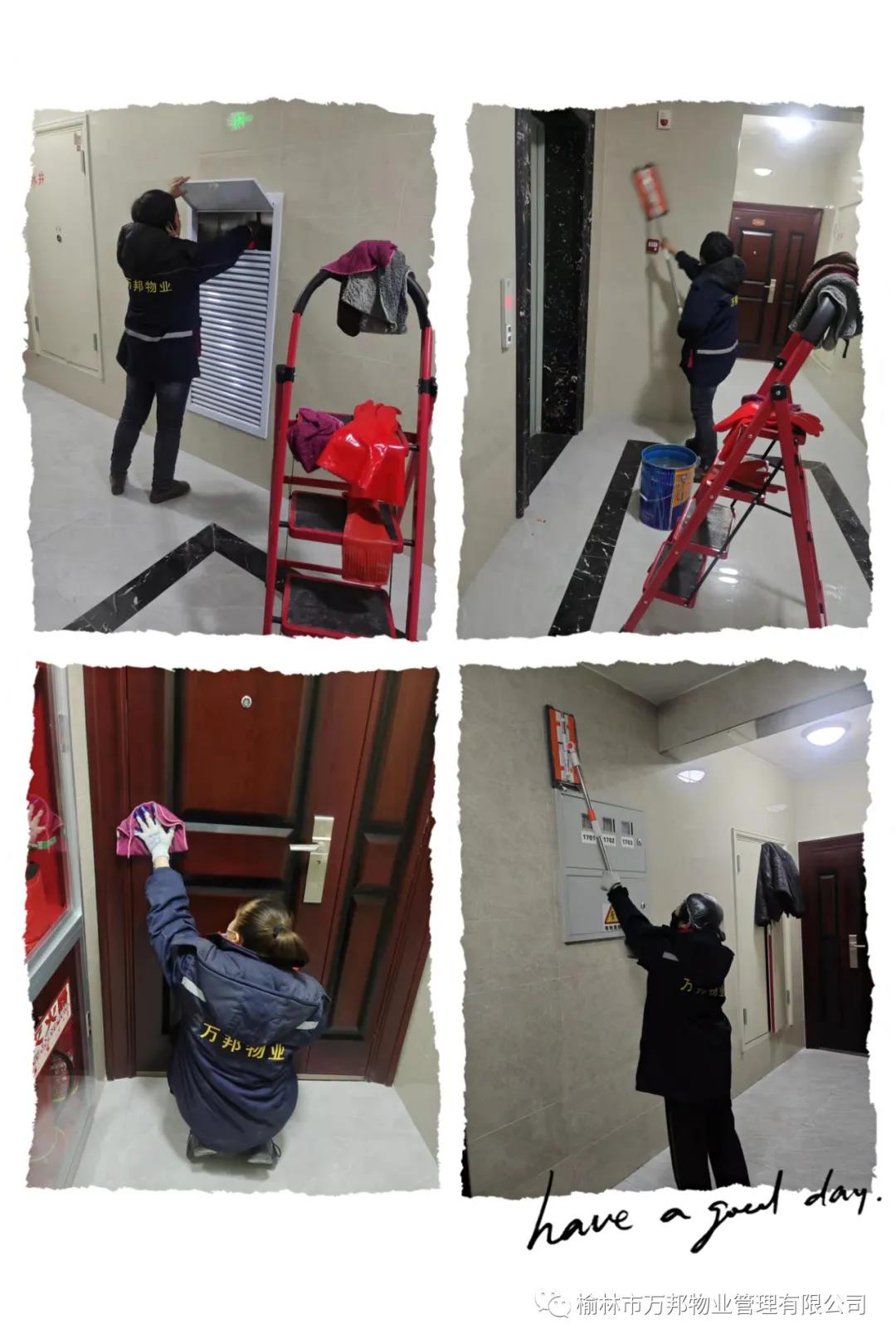 環(huán)境部工作人員使用專業(yè)的設(shè)備和清潔劑,對(duì)墻面、地面、及玻璃上的污漬及裝修殘留垃圾進(jìn)行清理,各項(xiàng)工作井然有序的進(jìn)行著!她們精心檫拭著每一個(gè)環(huán)節(jié),力求為業(yè)主營造出無污漬、光亮潔凈的居住環(huán)境!